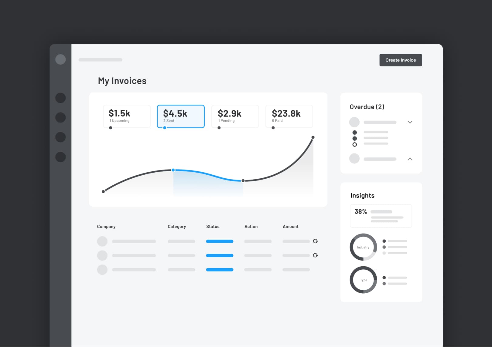 I'm exploring an invoice tracking tool for Freelancers. Here's my initial wireframe showcasing how users can interact with the graph to filter by invoice status to quickly complete tasks like sending out reminders.